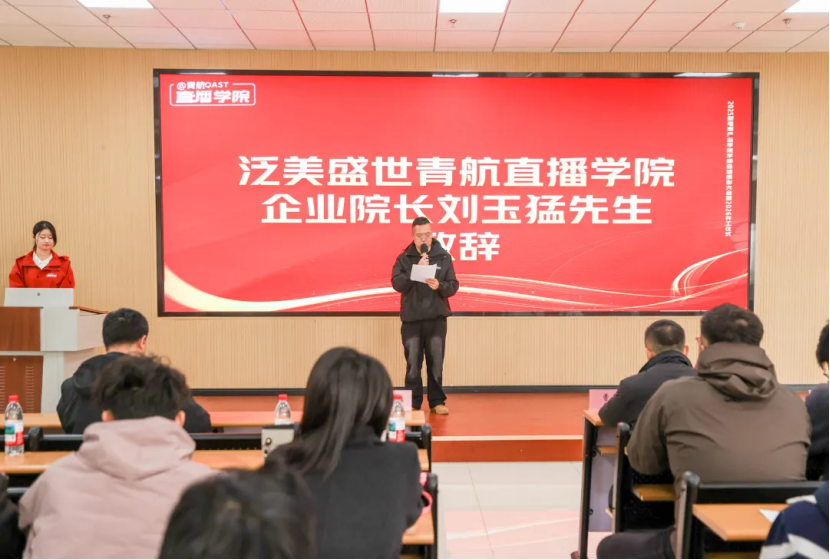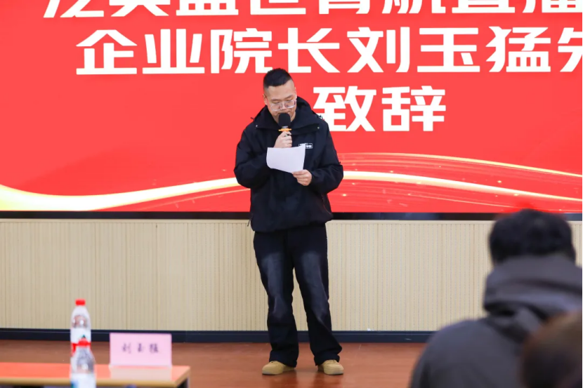 大会伊始,泛美盛世青航直播学院企业院长刘玉猛先生登台发表开场致辞,向莅临现场的各位领导表示感谢,向全体师生的辛勤付出致以敬意。他在致辞中全面回顾了学院2025年的发展成果,细数了学子们在专业领域取得的亮眼成绩,用硬实力彰显了“北方模式”的培养成效。