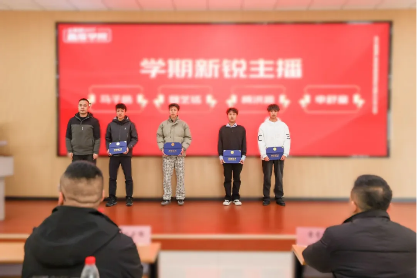 随后,大会进入隆重的表彰环节,对学期里在专业领域表现优异的学子、深耕育人一线的导师予以表彰,每一份荣誉都凝聚着汗水与坚守。教务处刘瑞处长为马同学等4名同学颁发学期新锐主播奖,表彰他们锐意进取、快速成长的专业态度。