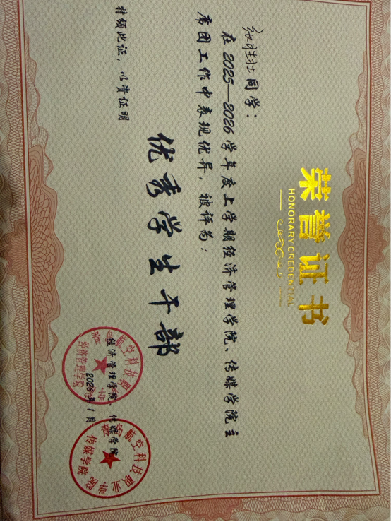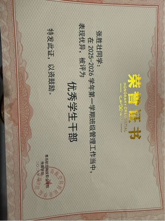 张胜壮是传媒学院数字媒体技术专业的优秀学生,一名光荣的共青团员。他以踏实笃行的态度深耕专业,以责任担当践行青年使命,在学业、竞赛与学生工作中稳步成长。他曾获“优秀团员”“优秀学生干部”等荣誉称号,并担任院级学生会副主席。