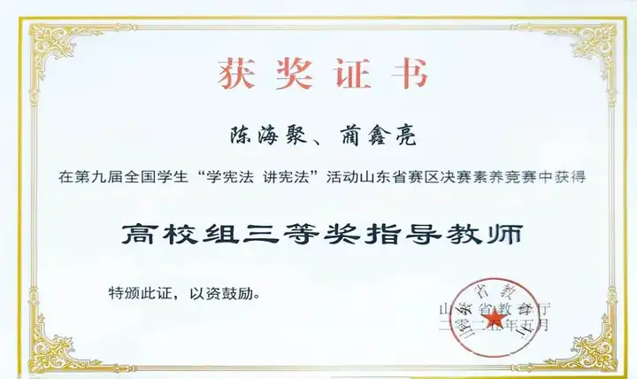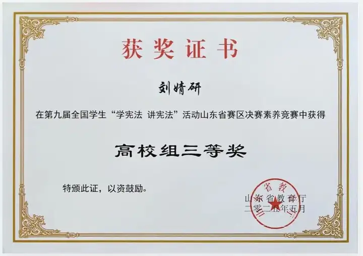 近日,在第九届全国学生“学宪法讲宪法”活动山东省赛区决赛素养竞赛中,我校学子刘婧妍凭借对宪法知识的深刻理解与出色的综合素养,斩获高校组三等奖。陈海聚获“优秀指导教师”称号。