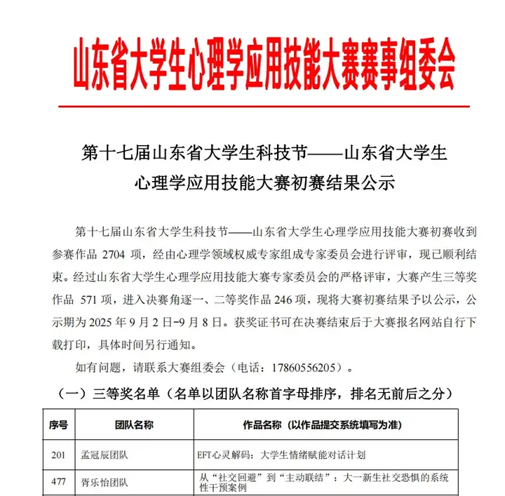近日,第十七届山东省大学生科技节——山东省大学生心理学应用技能大赛初赛圆满落幕,我校孟冠辰团队与胥乐怡团队双双发力,斩获山东省三等奖。
