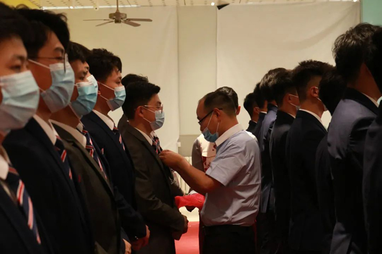 伴随着庄严激昂的国歌入团仪式拉开帷幕。会场上,同学们目光坚定,尽显新时代青年的蓬勃精神,共唱国歌结束后,学院领导及老师们为新入团的同学佩戴团徽。