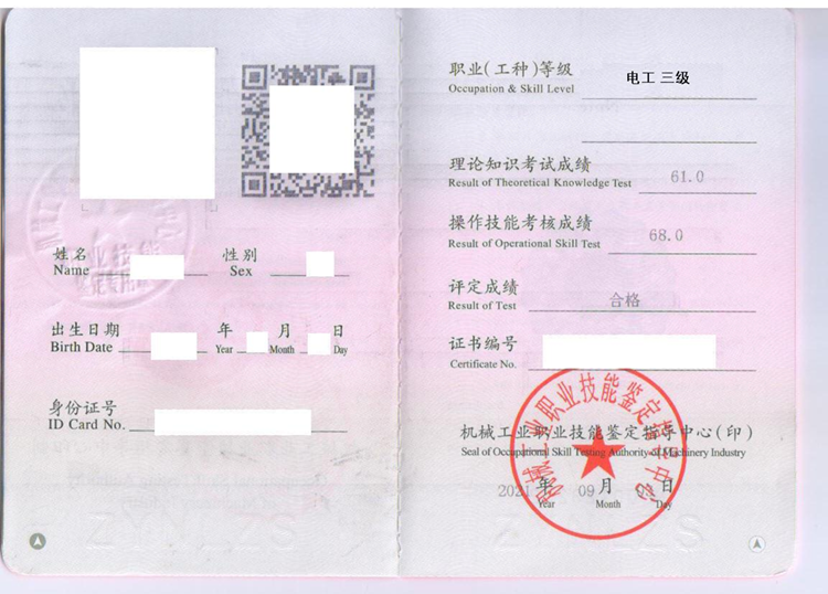 电工(三级、四级):培养从事机械设备和电气系统线路及器件等的安装、调试、维护、修理的人员。(颁发机构:机械工业职业技能鉴定指导中心 机械行业职业能力评价青岛469考试站)