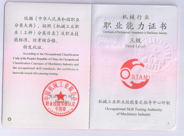 钳工(三级、四级):培养从事机械设备装调、维修及相关零件加工和工装夹具制作的人员。(颁发机构:机械工业职业技能鉴定指导中心 机械行业职业能力评价青岛469考试站)